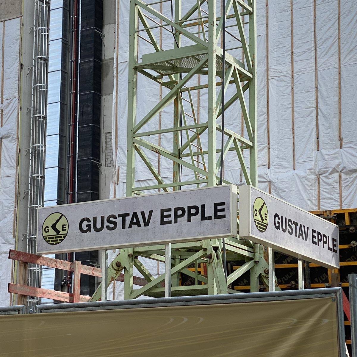 Hier im Einsatz bei Fritz Meyer GmbH – eines von über 2.000 statisch geprüften Kranleuchtschildern im realen Baustellenbetrieb.