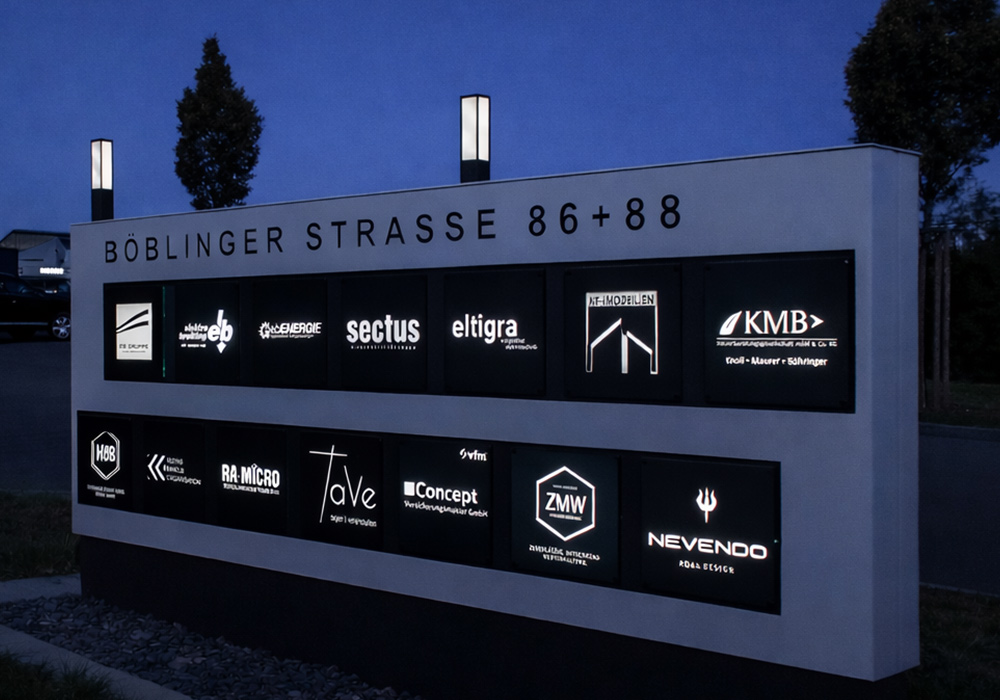 In beleuchteter Firmenauftritt steht für Qualität, Stabilität und Professionalität – besonders im B2B entscheidend.